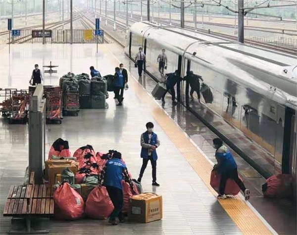广铁集团日均综合运用近200趟高铁载客动车组运送高铁快件。除利用复兴号等新型高铁列车快运柜、大件行李存放处和二等座最后一排座椅后方等放置快件之外,15列动车组预留车厢运送快递包裹。在较大城市间开行3趟运行时间1小时以上的高铁确认列车,每天装载量都保持在800件、10000公斤,确保高铁运力满足社会需求。