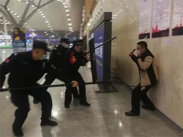 同时,该所还在夜间无高铁列车运行间隙,利用有限的场地,以警棍、盾牌、钢叉、手铐、枪支、徒手防控等为练兵内容,针对可能遇到的刀斧砍杀、暴恐袭击、精神病人闹事,积极开展警械使用和最小作战单元反恐演练。在练兵过程中,所队小教官通过现场示范、细化分解、警情模拟、交流互动等方式,使民警熟练掌握警械使用的基本常识和要领,紧盯能力素质“短板”,苦练看家本领。