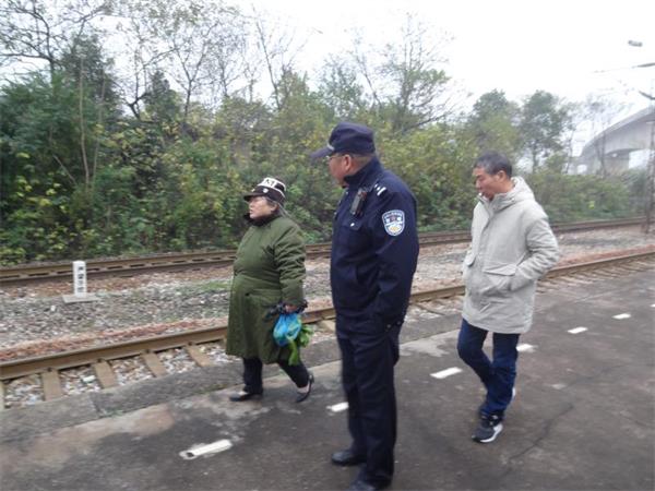 12月6日15时50分许, 长沙铁路公安处湘潭东站派出所接到湘潭东站信号楼报警称:湘潭东站二调司机发现湘钢专用线K0+804m处路基上有行人,并且正往沪昆正线方向行走。接报后,该所所长赵峰带领民警即赶往现场,发现一个身穿绿色军大衣、提着一兜青菜的老太太,正在铁路边行走,遂上前询问,发现其神情呆滞,说话语无论次,思维混乱。既说不出自己的姓名,也说不出家人的联系方式和住址,无法沟通交流,身上也没有何通讯工具、身份证件等。