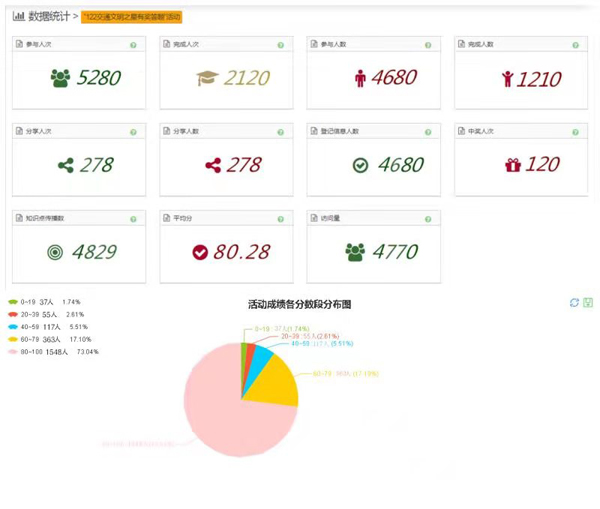 活动开展后,得到了社会各界人士的广泛参与和积极响应。活动截止到2020年1月6日活动圆满结束,共有5280人参与,完成有效完成有奖答题达到2120人次,知识点传播数达到4829题,平均分值达到80.28分,有力的做到了道路交通安全知识的一次大普及。同时通过活动参与者们的再学习、再传递、再宣传的作用,进一步扩大交通安全知识的宣传教育效能。