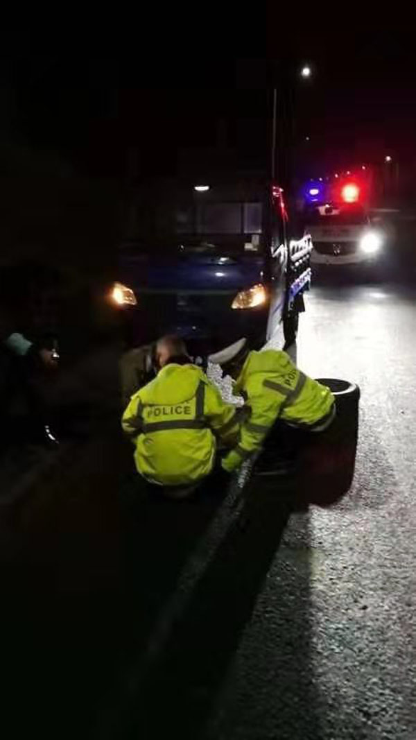 送回老人,刘队长带人继续上路巡查。晚9点多,途径桂嘉路燕塘圩附近时,看见黑暗中一辆三轮车停在路旁。民警们停住警车,下车探个究竟。三轮车方向不断传来“当当当”的敲击声。民警走近一看,一位男子蹲在车轮前搓着手,焦急的拿换工具,原来是三轮车前台爆了,正在换胎。刘队长上前轻拍着师傅的肩膀问:“怎么了,车修不好吗,需要我们帮你修吗?”。三轮车师傅一看是交警,说:“搞了蛮久了,不晓得怎嘛办了”。刘队长打着电筒,蹲下一看,虽然工具齐全,但三轮车师傅没有掌握换胎技能,折腾了很久仍然没有换好轮胎。刘队迅速招呼随行的交警,熟练的使用工具,帮忙换上了轮胎,整个过程仅用了7分钟。三轮车师傅十分感动,连忙启动了车子,伸出大拇指,“谢谢了,想不到你们交警还有这一手”。