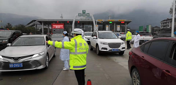 在辰溪南高速出入口,医务人员和交警正在为进入辰溪的车辆和人员登记、测体温。虽然天气寒冷,但医务人员和交警很是尽职尽责,对每位人员进行仔细检测,详细询问他们的轨迹,并一一做好记录。