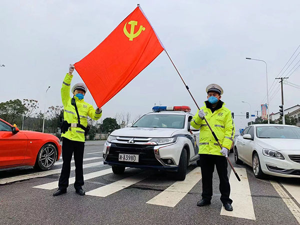 抗击疫情是一场持久的攻坚战,一个支部就是一座堡垒,一个党员就是一面旗帜!2月1日,长沙市望城区交警在疫情防控点组织开展战时动员、向党旗宣誓活动,坚持在党的领导下充分发挥基层党组织在疫情阻击战中的战斗堡垒作用、共产党员的先锋模范作用,确保党中央重大决策部署贯彻落实,让党旗在防控疫情斗争第一线高高飘扬。(记者:杨德平 通讯员:钟泽宇 郑伟)