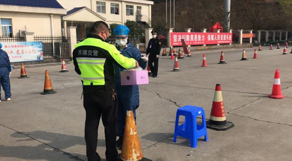 张斐斐,是特勤中队的一名辅警,已在大队工作6个年头,自新型冠状病毒感染的肺炎疫情防控工作启动以来,他主动请缨,加入大队党员突击队,日夜坚守在辖区的常德太阳山高速出口检查点,每日负责指挥疏导交通,排查入城车辆,劝返湖北籍人员。他的妻子覃双,是常德柳叶湖社区医院的一名护士,1月24日,妻子接到上级命令后也被分配到了太阳山高速出口检查点,同样是24小时轮班坚守,负责对过往车辆司乘人员进行体温检测。自此,新婚还不到三个月的夫妻,便共同坚守在了同一阵线,各司其责。