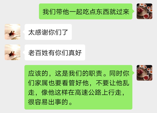 2月1日上午7时许,省高警局衡阳支队祁东大队民警罗雨、辅警陶醉巡逻至泉南高速公路858公里处发现一名男子。民警将其带到护栏外,询问情况,男子自称姓唐,住在祁东,具体地址记不清。罗雨到周边村民询问情况未果,遂将该男子带上警车并送往归阳派出所查找其家属,谁知在派出所也无法确认男子身份。放心不下,罗雨将他带回队部,做好体温测量和消毒措施。担心男子没吃饭,罗雨又为其找来水、快餐面、小蛋糕等食品。民警猜测男子可能不是归阳人,随后电话给祁东县公安局询问近期有没有接到有人员走失的报警,同时联系其他派出所。