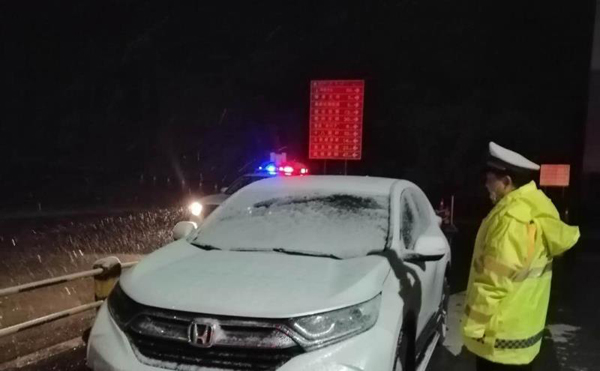 2月15日晚,大雪落山,疫情当前。矮寨三中队交警们坚守在天气最为恶劣的矮寨坡顶及省级春运检查站,为应对低温恶劣天气随时做好准备。不一会儿,天空就开始下起了下雪,对于足不出户的市民来说,在家赏雪是一番独特的感觉,而对于交警们来说,则是更为艰难的挑战。以雪为令、主动出击,加强在易结冰路段巡逻守候,严格按照应急预案。并将情况及时上报至指挥中心,通知各施救部门及时采取相对应措施,不让危险发生在每一处。打开警灯、警报喊话、设置诱导警示屏、发布双微路况信息,提醒来往车辆减速慢行、注意安全,沉着应对。即使脚底冰冷,沾满雨雪,他们也决心要把身后这座城守护好。