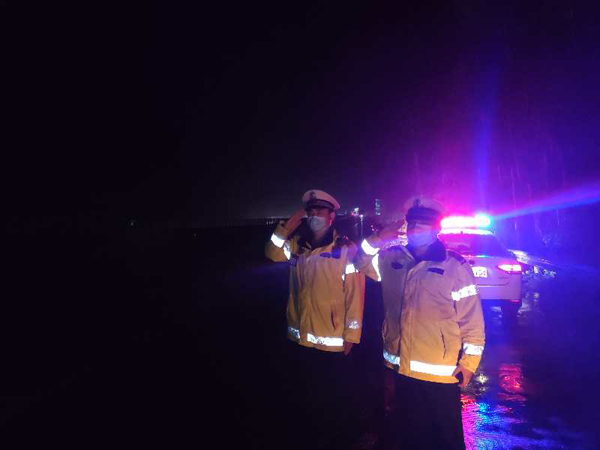18时10分,耒阳大队接力护航,此时天色渐暗,辖区下起了大雨,高速交警冒雨护航,以最深敬意、最高礼遇致敬白衣天使。19时15分,车队由郴州支队接力护航。21时39分,车队到达湘粤交接的粤北停车区,韶关高速交警接手护航。