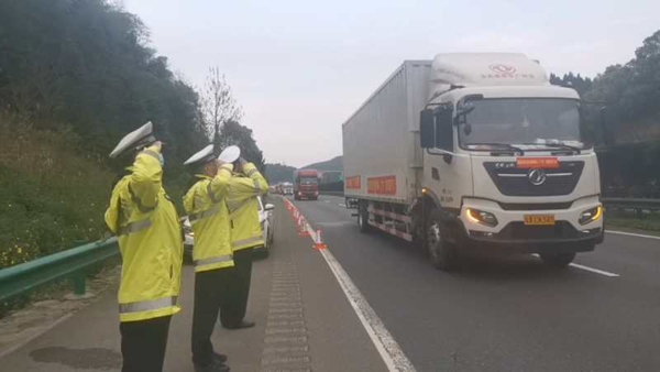 为保障车队安全,衡阳支队一组警力前方开道牵引,新塘大队两组警力收尾护送,敬礼目送援鄂车队返航。在雁城服务区,高速交警和2名群众还在天桥上远远的向援鄂医疗车队敬礼、挥手致意,欢迎白衣英雄们凯旋。