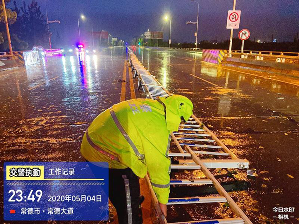 一场突如其来的暴风雨,打破了原有的宁静。5月4日晚11时47分许,常德市交警直属二大队三中队民警巡逻至武陵区常德大道沅水二桥路段时,发现道路中央的隔离护栏被大风挂倒在地。由于护栏倒塌的面积较大,加上该路段机动车较多,不仅严重扰乱交通秩序,还存在很大的安全隐患。