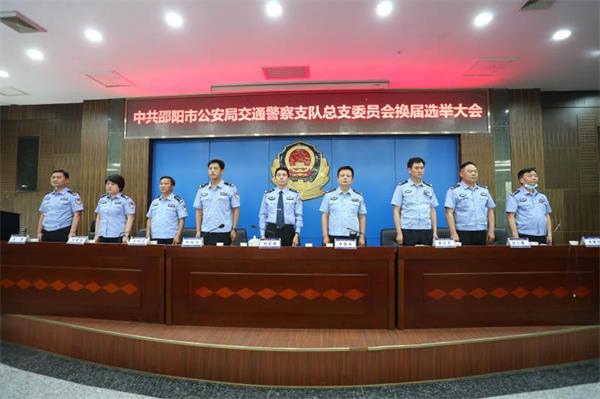 “起来,不愿做奴隶的人们,把我们的血肉,筑成我们新的长城……”,5月9日,在邵阳市公安局交警支队二楼会议室,该支队205名正式党员和11名预备党员民警,集体起立,共唱国歌,拉开了中共邵阳市公安局交警支队党总支委员会换届选举大会的序幕。