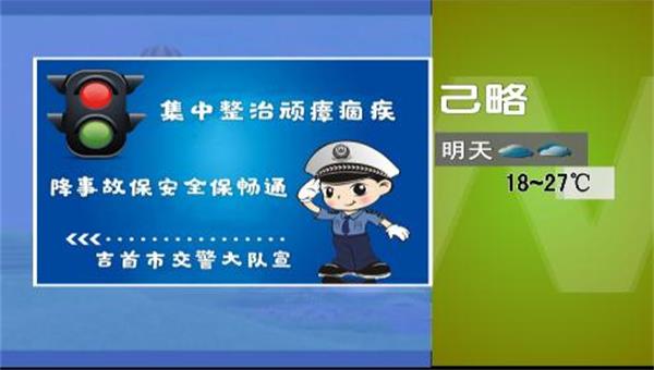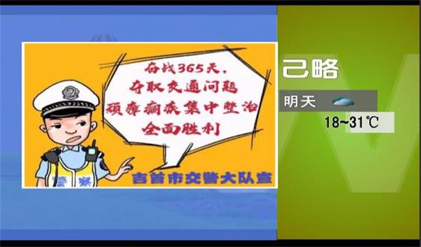 为了拓宽宣传形式,大力营造家喻户晓、全民参与的浓厚社会氛围,全面加强交通安全宣教工作。吉首市公安局交通管理大队联合湘西州电视台气象部门,以保障道路交通安全、服务群众出行为切入点,精心策划部署在天气预报播放时增加交通安全提示语,以提高广大人民群众知晓度和支持率。