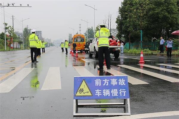 随着警笛响起,大队民警迅速到达“事故”现场,按照预案部署,组织警力疏散围观群众,划定警戒区域,设置警戒带、摆放锥形筒等警示标志,指挥、引导过往车辆分流或绕道行驶。对事故现场进行调查取证和实地勘查后,随即解除交通管制,交通秩序恢复正常。