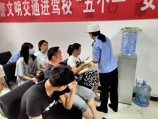 同时,宣传队员倡导学员们发挥示范带动作用,积极宣传交通安全知识,督促提醒身边亲朋好友养成驾乘摩托车及电动车佩戴安全头盔、驾乘汽车系好安全带的良好习惯。随后,宣传队员为广大学员发放了“一盔一带”宣传彩页资料,让学员坚决做到思想上高度重视,行动上自觉遵守,真正做到安全驾驶、文明出行。