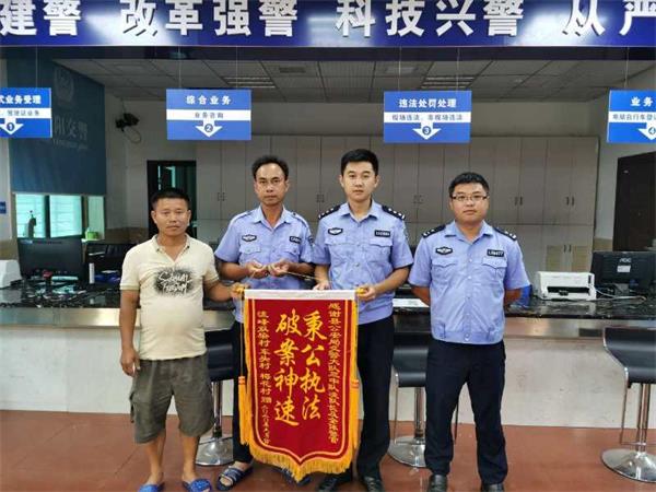 5月16日,经过民警的多次努力说服,驾驶员彭某委托亲属赶到流峰镇,主动请求交警调解处理。 6月8日,车头村干部尹石芳、村辅警尹桂君特地来到流峰中队,将一面“ 秉公执法 破案神速 ”的锦旗赠给交警,以表谢意。