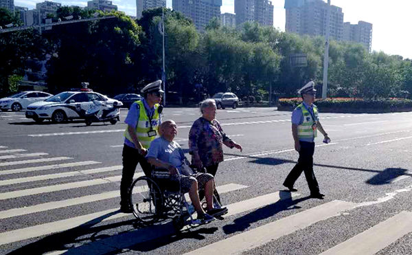 当天早上8时15分左右,在常德市城区柳叶大道长庚路口,常德交警支队直属一大队三中队民警印华辉带领辅警瞿辉、朱伟正在执勤早高峰,指挥疏导交通。这时一位满头银发的老奶奶步履阑珊的推着坐在轮椅上的老爷爷正在斑马线上准备过马路。面对川流不息的车流,两位老人一时犯了难。这一幕被正在路口执勤的三中队民警印华辉和辅警瞿辉、朱伟发现并迅速赶过去。警员们立即上前一边帮忙推着轮椅,一边现场指挥过往车辆减速让行,很快就护送两位老人安全走过了斑马线。将两位老人护送到安全地带后,经了解得知,坐在轮椅上的老人因中风需要前往常德康复医院治疗。