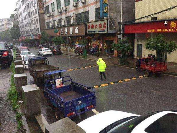 6月25日,正值农历端午节,连夜暴雨持续到白天不歇,衡南县境内多地路段被淹,交通隔断,特别是县城区多条主干道和十字路口犹如汪洋一片,行人、车辆出行受限。衡南交警冒雨出动,打赤脚探路、排险,指挥车辆、行人安全通行,确保端午节日道路安全畅通。