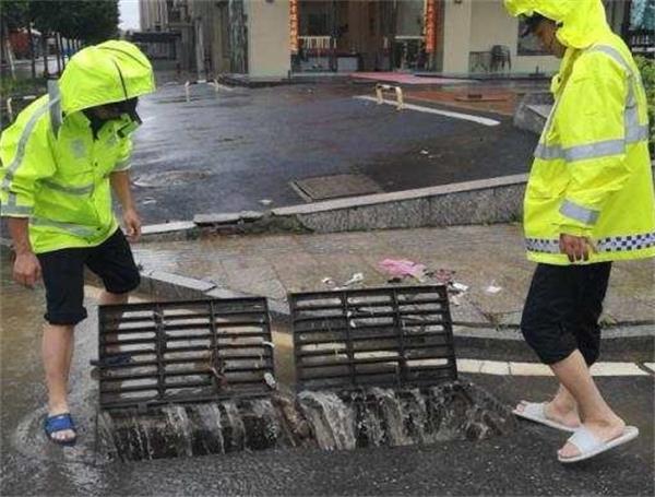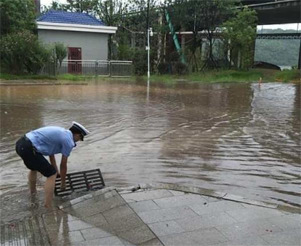 随即,县城云集中队立即集合全体队员,分多路巡查县城街道。中队指导员张少明带领一队民警来到县城新塘和滨江路段,见道路多处已成洼地一片,过往车辆被阻隔,无法通行。此时,暴雨越下越大,积聚的雨水已漫涨到路面台阶,中队指导员张少明凭经验判断,有可能下水道网盖被杂物堵塞,造成水流无法排泄。于是,民警们脱掉鞋袜打着赤脚,在洪水中探寻着下水道口,拨掉杂物,掀开盖板,加速排水泄洪,待排洪至安全水位,再指挥车辆依次通行。就这样,云集多条水淹道路在赤脚交警的疏导下恢复通行。