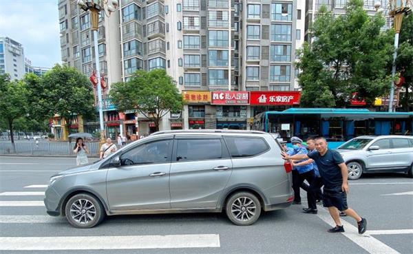 了解完情况后,彭培林、罗维、李志强、何涛四名交警考虑此时正值午高峰时段,商量后决定先将车辆推至不妨碍交通的路边,之后再等待救援车辆。于是,四名交警和周边热心群众一起分工,一边疏导交通指挥车辆有序通行;一边让驾驶员将档位挂至空挡,合力将车辆推至路边安全地带,并嘱咐驾驶人联系救援车辆在旁等待,故障小车在警民合力之下推移成功。烈日下的齐心协力,手掌上的高温滚烫让大家的心更为紧密,驾驶员在看到自己的爱车得到妥善处置,路段交通秩序也没因此受到影响,连连向执勤交警表示感谢。