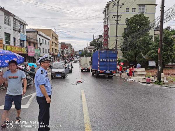 6月30日上午,暴雨肆虐的平江县加义集镇路口已成一片“汪洋”,所有车辆都不能通过。平江交警大队队长徐晚谱和教导员李树林带领治超中队全体警员迅速赶到现场,冒雨开展防汛工作。一方面,他们到加义集镇协助当地政府疏散群众,一方面对水淹路段交通进行管制,疏导交通。