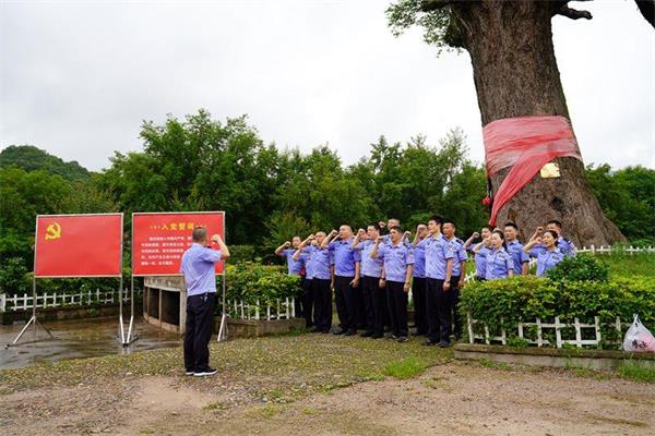 活动最后,队伍到达溪口镇樟树村红军树广场,大队副大队长吕国荣同志带领全体党员民警,在红色革命“见证者”红军树下,整齐列队,高举右臂,重温入党誓言,共同表达公安交警党员“对党忠诚、服务人民、执法公正、纪律严明”的决心。