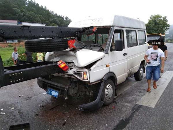 7月10日上午,在107国道衡山县长江镇石子村路段发生一起交通事故,事故处理民警达到后,发现事故现场触目惊心:一辆小型客车的车头被前车所运载的商品车大梁刺穿。经现场勘察、调查,驾驶员刘某康驾驶浙G9XX73小型客车与前方同向行驶的大货车跟车过近,遇紧急情况时避让不及,致使小型客车追尾前车,所幸未造成人员伤亡。刘某康因违反《中华人民共和国道路交通安全法》第43条:“同车道行驶的机动车,后车应当与前车保持足以采取紧急制动措施的安全距离。”之规定,承担该起事故的全部责任。
