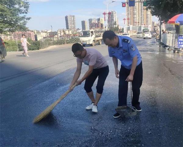 8月2日下午16时25分许,在资江一桥北塔区桥头,一辆运河沙车辆因未装载严实导致不少河沙洒到路面上,过往的电动车行驶在该路面时,车轮与河沙摩擦,人车总是摇摇晃晃的,致使路面存在较大的安全隐患。北塔区交警大队副大队长张成见状,迅速拿着扫帚和撮箕,经过近10分钟的清扫,才把河沙扫得干干净净。清扫中,过往车辆驾驶员见交警在当“清洁工”,都放慢了行车速度,伸出大拇指连连称赞。