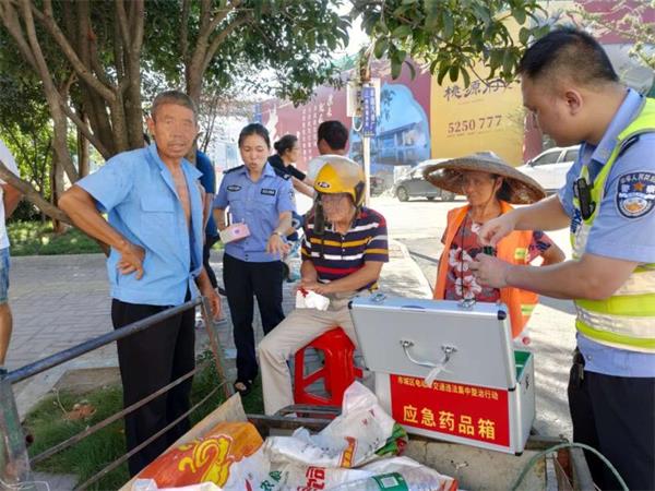 8月3日上午,在西湖南路脑科医院路段,一台逆向行驶三轮车,与在非机动车道正常行驶的一辆二轮电动车发生刮擦,电动车驾驶人刘某被刮擦后,连人带车一同倒在地上,事故不仅导致刘某的左手全部擦伤、小拇指指甲脱落,还因倒地时头部着地而感到疼痛难受。据刘某陈述,幸亏自己戴了安全头盔,否则头部肯定受伤不轻。执勤民警潘雨豪当即拿来执勤备用的药箱,帮他清洗伤口并给他止血,用最真诚的救助获得在场群众的赞许目光。