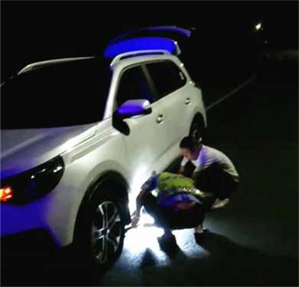 为了消除安全隐患,巡逻交警立即下车了解情况。原来是车主李先生回永兴老家办事,途经该路段时车辆左侧前轮压到障碍物,突然爆胎,走不了了。李先生是驾驶新手,不会换轮胎,这里人生地不熟,手机还没电了,正发愁不知道怎么办呢?见此情况,交警周小建、李平飞立即到车上拿反光锥筒和工具箱,在故障车辆来车方向50米处依次摆放好锥筒做好警示,指挥车辆绕道而行。有着多年驾驶大客车经验的李平飞则拿着工具箱来到爆破的车胎前开始忙乎起来,拧螺丝、撑千斤顶、找备胎、上胎卡位……,不一会儿就把轮胎换好了。车主李先生看到累得满头大汗的交警,感激不已,满满的谢意只能通过连声“谢谢”来传递。