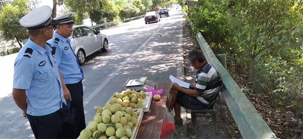 当日,大队长雷东升带领民警冒着炎炎烈日,深入辖区322国道等农村乡镇道路对交通安全隐患进行排查,巡逻到322国道紫冲路段时,发现路边有一个摊点。只见一名村妇在公路边的沟渠上铺上木板,摆上小方桌,上面放置着瓜果和电子秤,边上还放着水桶和筐子等,村妇自己则坐在一张椅子上,还不时向路过的车辆吆喝叫卖。据了解,村妇想出把木板铺在沟渠上摆摊是有原因的,因为该路段是两车道,比较狭窄,而国道公路路况又比较好,往来的车速比较快,如果把摊点摆在公路上,占据了一部分道路后很容易酿成交通事故,所以村妇才想出这个自以为安全的点子来。但她的摊点还是占据了一部分道路,并且如果有司机停车来询价、品尝或者购买瓜果,同样存在着交通安全隐患。经交警对村妇进行教育后,村妇表示接受批评,收摊离开。当天,交警还发现另外两个路边摊点,均对摆摊村民进行劝离。