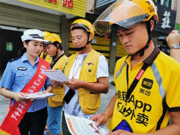 为扎实推进“一盔一带”安全守护行动,切实加强外卖送餐人员骑乘摩托车和电动车出行时规范佩戴安全头盔意识,提高交通出行安全防护意识和水平,全力推动“减量控大”目标,9月2日,辰溪交警组织宣传小分队赴辖区“美团外卖站”开展“一盔一带”主题宣传教育活动,发挥及时配送行业示范引领作用,倡导市民增强骑乘电动自行车、摩托车交通安全意识。