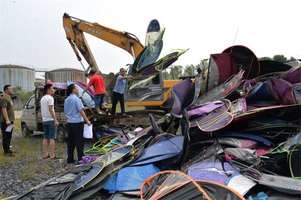 销毁现场,常德城区直属各大队将收缴来的遮阳伞具共9733把集中堆放在一起,在挖掘机的轰鸣中,采用对环境无污染的“碾压”方式进行统一销毁。交警支队交通秩序管理部门负责人介绍:电动车、摩托车非法加装遮阳伞、遮阳棚会遮挡骑行者视线,大风天气,还易致车辆失去平衡,若发生交通事故,更有可能被钢制的伞架伤及身体,甚至危及生命。