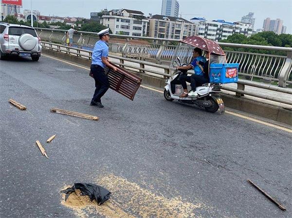 见状,民警向敏在确保自身安全的情况下,迅速将车靠边停下,一方面指挥过往车辆提前减速谨慎行驶,一方面化身“清障工”,上前将遗落路面的木板和黄沙清理至安全区域。经过十几分钟的努力,路面的散落物被全部清理干净,道路恢复了安全畅通。交警及时清理散落物的举动,受到过往驾驶员、群众的一致好评。