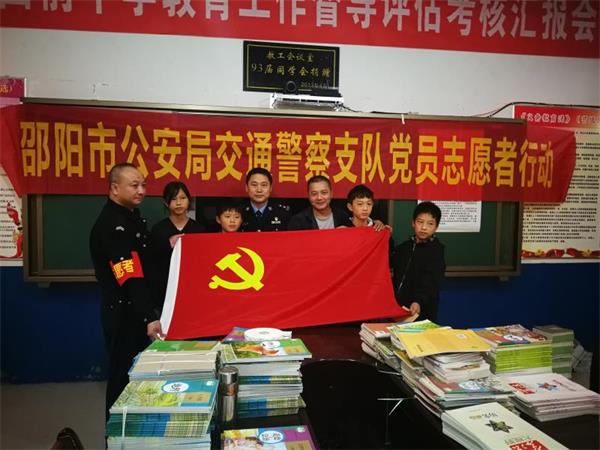 这天上午,受邵阳市公安局交警支队党委委托,党总支委员彭依龙等党员志愿者一行,驱车80多公里,来到邵东市堡面前中学,开展“爱心助学”活动,为4名特困学生送去爱心助学款,并与学生师生一起“文明实践 四季同行”志愿者服务活动。