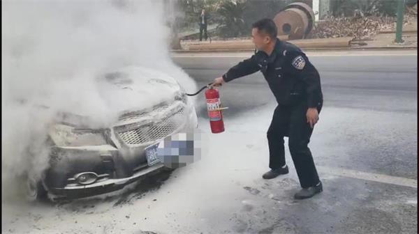 当日下午17时许,益阳市公安局交警支队资阳大队民警曾志勇、辅警熊军在办案返回途中,突然听到有人的呼喊:车子起火了!起火。”民警望去发现前方路旁一辆小车的引擎盖里正冒出阵阵浓烟,还有火苗窜出……民警曾志勇见状立即对现场进行紧急疏散,引导过往车辆分流绕行,辅警熊军拿出警车上的灭火器迅速对火势控制,最终将火扑灭。