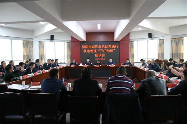 在随后召开的邵阳市城区非机动车通行秩序管理“开门纳谏”座谈会上,刘定湘介绍了当前邵阳交警队伍的现状,并从实施机非分道通行、推进电动车上牌管理、确保市民安全出行等方面,介绍了电动车管理工作情况。与会嘉宾们对邵阳交警“在有限的条件下,发扬艰苦奋斗精神,加强交通安全管理,确保市民平安出行”工作进行了高度肯定,他们一致表示:交警工作的环境最恶劣,他们的工作最辛苦、他们的加班最常态。并围绕如何搞好城区交通秩序纷纷建言献策。在解决群众过街难上,在大型学校、医院、超市附近,要增设地下人行通道或人行天桥过街设施;在破解城区停车难上,重点路段要“瘦身”绿化带,合理增加停车位;在强化校园交通管理上,交警部门应联合教育部门,开设交通法规安全知识课;在缓解邵阳大道拥堵上,要打通宝庆东路上邵阳大道的断头路,做好交通分流等多项建议。特别是就如何规范电动车管理,各位嘉宾们先后提出了如下建议:一要加大执法力度,利用现场执法、电子警察等多种方式,严厉处罚电动车违法行为;二要加大宣传力度,通过媒体、官方微博微信持续曝光电动车违法乱象;三要加强安全教育培训,上门开展宣讲,不断提升快递、外卖等行业驾驶员交通安全意识。