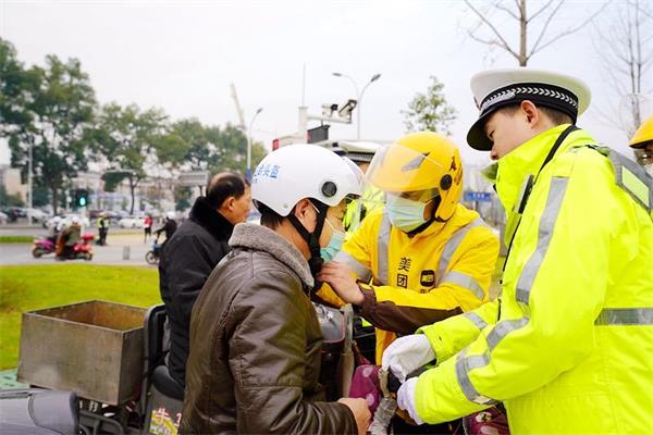 活动中,宣传民警首先对“外卖小哥”进行面对面交通安全知识培训,讲解佩戴安全头盔和正确使用安全带相关法律知识。随后,带领“外卖小哥”来到红绿灯路口向过往行人、非机动车驾驶人发放“一盔一带”、“知危险会避险”等宣传彩页,阐明摩托车、电动车骑乘人员佩戴安全头盔的重要性,对不戴头盔、不系安全带的人员进行劝导并发放安全头盔。同时,针对逆向行驶、不走非机动车道、闯红灯等交通违法行为的摩托车、电动自行车驾驶人现场进行批评教育。