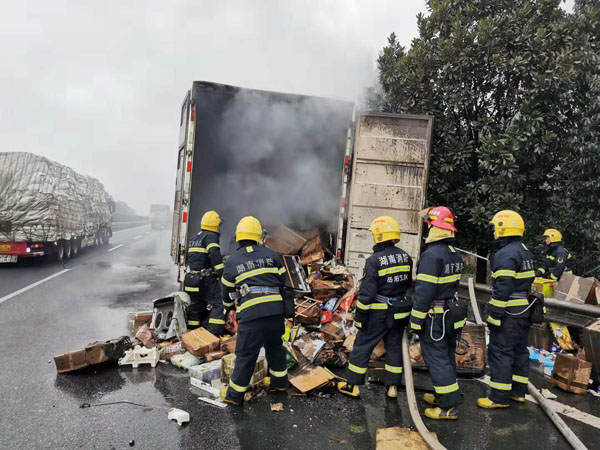 1月9日下午15时许,京港澳高速由北往南1376岳阳县路段一辆运载物流货车起火。