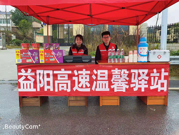春运第一天,益阳管理处灰山港收费站组织志愿者在收费现场开站“迎佳节,送温暖”的志愿服务活动,把关怀和温暖送到来往司乘心中。灰山港收费站在收费广场设立便民服务点,提供热水、方便面、应急药品。