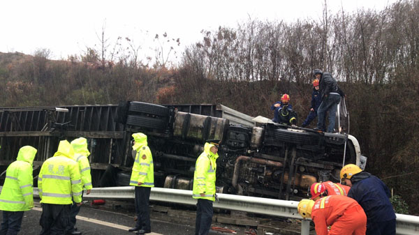 1月10日,春运第一天,10点20分左右,湖南省高速公路集团有限公司岳阳管理处岳阳东路政大队接到报警称,在大岳高速转岳望高速西往东方向的公城互通上,一辆满载12吨快递的大货车发生侧翻,驾驶座里有人员受困,请求支援。