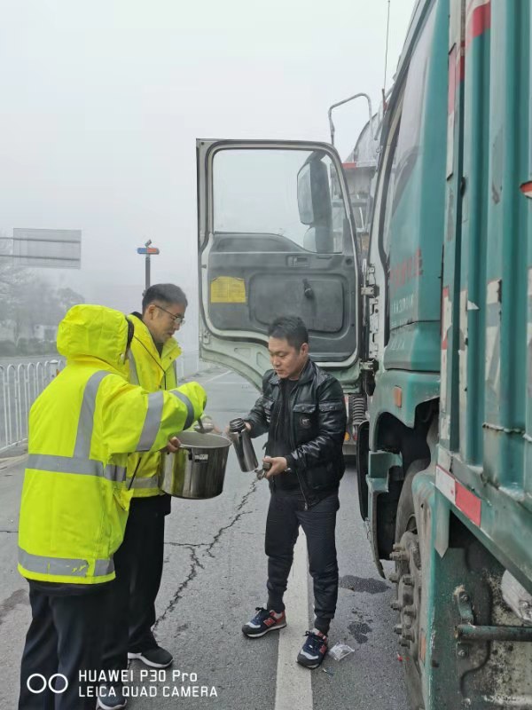 1月12日凌晨一点钟,春运第三天,天空笼罩着一层大雾,高速公路上能见度非常低,接高速交警通知,星沙收费站入口实行交通管制,许多跑长途的货车司乘朋友都停在收费站排队等候,早上6点多的时候,大雾不退反而更浓,眼见排队的车辆越来越多,气温也越来越低,星沙站工作人员在疏导排队车辆时发现,天冷气温低,货车车内大多数都没有空调,即便是有空调,大家也舍得开啊,得知这一情况后,值班站长立即嘱咐食堂熬制一大锅浓浓的红糖姜枣茶送到现场,并安排大家分批依次给排队的司乘朋友送姜茶,这一杯杯热腾腾的姜茶,就像冬日暖阳流进了司乘朋友的心,于是这暖心的一幕被这位等候了7个多小时的车主小伙跟拍了。