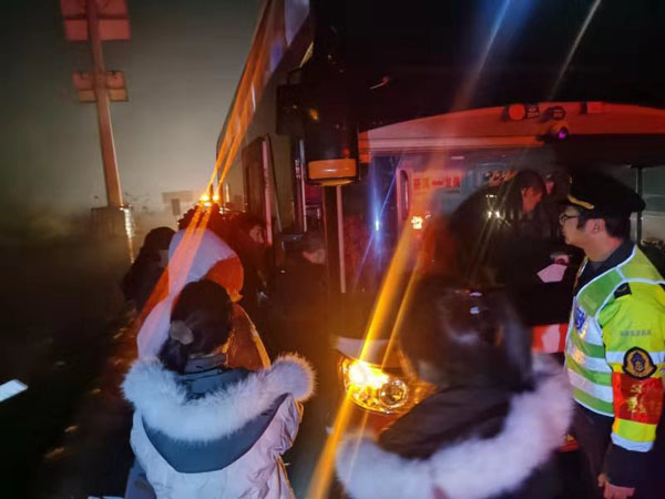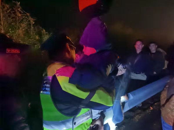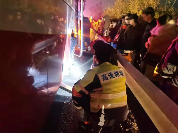 到达现场后,林江和田野看见一辆大客车停在应急道上,开着双闪,不时有车上乘客在高速公路上观望。夜幕降临,该路段刚好又是转弯的长下坡,过往车辆纷纷鸣笛避让。他们立即根据现场情况,进行应急救援。田野在客车后方设置安全设施,手持指挥棒示警,避免发生安全事故,林江则迅速将乘客疏散至路侧波形护栏外侧。此时,辖区内清障救援队伍也已经赶到,施救人员先对大客车进行检查,在确定客车因爆胎导致故障后,立即更换轮胎,并告知司机大约需要30分钟。虽然只有短短30分钟,但这期间的安全维护工作却不能小觑,田野继续在后方示警,林江耐心的乘客沟通,嘱咐大家一定要听从指挥、注意安全,并将老人和小孩安置在路政巡逻车上,以免受冻着凉。