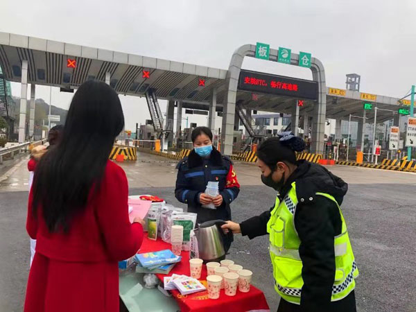 1月22日,板仓收费站联合开慧镇政府卫计办、开慧社区及开慧卫生院等,结合当前冠状病毒肺炎疫情,在收费广场开展主题为“平安回家路”的青年志愿者活动。