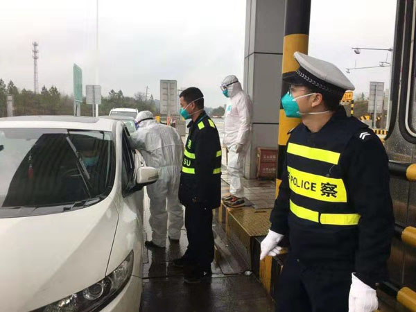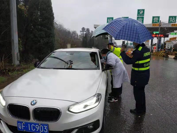 1月24日湖南高速集团衡阳管理处G4京港澳高速衡阳段公平路政大队巡逻队员在公平收费站收费现场协助医院防疫人员在对进出站司乘人员进行体温监测。(周娅娜)