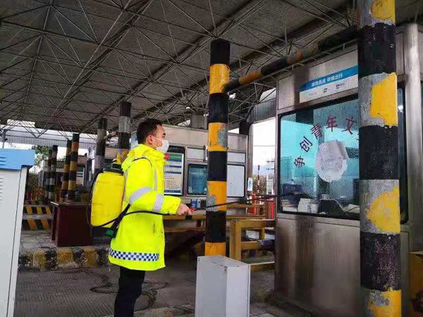 花垣西收费站临近重庆,省界站撤销后,成为了湖南省离重庆最近的收费站。收费现场是收费站服务司乘人员的最前线,现场的防护工作非常重要。这不,站部稽查人员正背着喷雾器,对收费现场进行消毒。