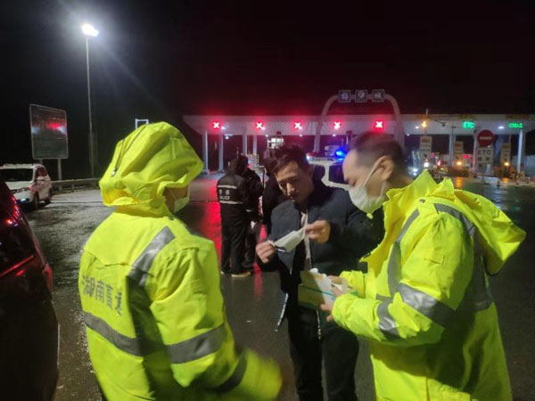 1月26日下午,邓浩轩冒着雨在辖区处理事故近两个小时,直到在事故处理完毕后,他才带着一身被雨水浸湿的衣服回到单位食堂,匆匆吃了几口饭又直奔收费现场,配合当地政府和医务人员实行一车一检。