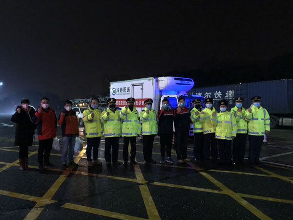 2月2日深夜,长沙地区寒风冷雨,长沙管理处路政安全科负责人带队来到京港澳高速公路昭山服务区,等待即将从株洲境内驶来的援汉防疫物资运输车辆。
