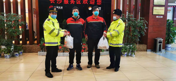 凌晨1时30分,该车抵达长沙服务区临时休整。长沙管理处提前为运输队员们准备了热水、饭菜等食物。