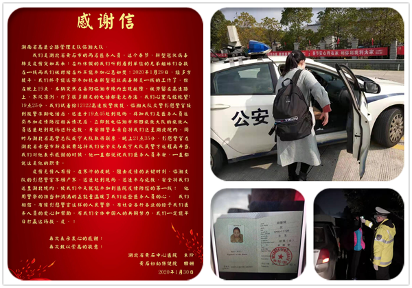 湖南、湖北隔江相望,洞庭相连,心手相牵。隔离病毒,不能隔离爱。全体民警在战疫情、保安全、促稳定的同时,全力保障运载防控物资和人员的车辆快速优先通行。临湘、平江、岳阳南大队相继采取警车牵引的方式帮助鄂籍车辆返程。1月27至31日,支队连续收到来自湖北咸宁、黄石、天门籍的8名政府、公安、医疗等部门工作人员要求返程参与疫情防控的请求,支队紧急联动湖北高速交警及相关应急部门,采取警车护送方式帮助他们返程回湖北。1月30日,黄石中心医院的朱玲、黄石妇幼保健医院的田姗一起发来感谢信,感谢民警在阻击疫情的关键时刻对她们车辆故障进行救援,并护送到湖北境内参与一线抗疫。