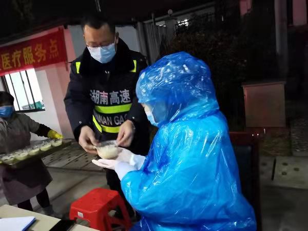 “同志们,战友们,辛苦了,快来喝碗甜汤,暖和暖和!”衡阳高速公路松木收费站疫情防控志愿者们来到收费广场疫情防控体温测量点,对现场参与疫情防控的当地医务人员、街道、交警、运管及同事们微笑地说道。“太好了,只是你们也够辛苦的了,这么晚了还给我们送甜汤。不过,天气寒冷,正好可以暖暖身子,谢谢你们!”“共同阻击疫情,应该的!甜汤我们煮了一大锅,多喝点。”志愿者们一边说道,一边将一碗碗甜汤递给疫情防控工作人员。