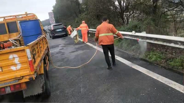 2月5日,京港澳高速衡阳段耒宜养护工区派出13名养护工,出发前全副武装,统一佩戴好一次性医用口罩,带上含氯消毒液及消杀装备。在京港澳高速耒宜路段K1706+396至K1739+612沿线双向停车港湾18处进行消毒。针对特别容易变质生成各种危害人体的细菌而成为“四害”滋生地的垃圾桶进行清洗、消毒处理。养护工们先用蘸有洗衣粉的刷子不停的反复进行刷洗,然后在用水进行冲洗,用消毒液进行喷洒。